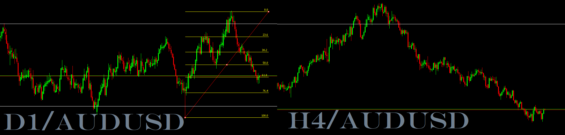 O preço do AUDUSD vem caindo bastante, desde o dia 30/09, e como sabemos, o mercado se movimenta em ondas. Acreditamos que a onda atual de baixa pode estar chegando ao seu fim e com isso uma correção para a alta pode estar próxima. no gráfico diário temos o preço falhando em romper a região de 61,8 de fibonacci e apontando novamente para cima, movimento esse que evidencia no gráfico de 4 Horas uma formação de W que é uma figura de reversão de tendencia, ainda nao rompido, mas podemos nos antecipar ao movimento para o risco retorno ficar mais atraente. RiscoXRetorno de apróx. 2:1.