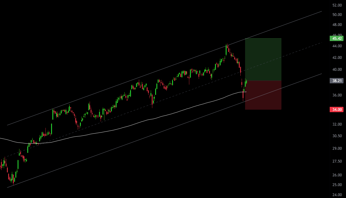 Esse é o caso do Bank Of America, que desde sua máxima de 2024 chegou cair mais de 20%. E agora, encontra-se acima da média móvel exponencial de 200 períodos do gráfico diário. Além disso, temos uma formação de canal de alta, que nos mostra a possibilidade desta queda ter sido apenas um momento breve de correção. Em resumo, uma oportunidade de seguir em compra no BAC.