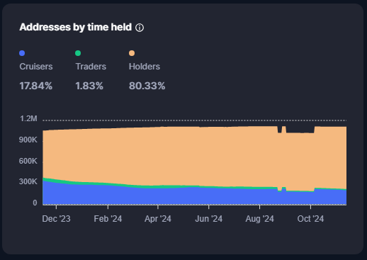 Em azul: Quantidade de endereços com $0 até $1k dólares de saldo. Em verde: Quantidade de endereços com $1 até $100k dólares de saldo. Em laranja: Quantidade de endereços com $100k dólares ou mais.