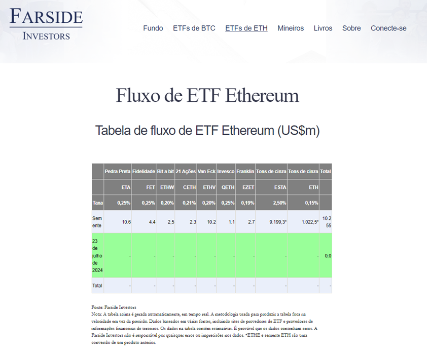 Por meio do site “Farside”, podemos avaliar as entradas e saídas de capital dos ETF’s de Bitcoin e Ethereum. Nos próximos dias, com maior quantidade de dados consolidados podemos avaliar como esta o desempenho do mesmo: