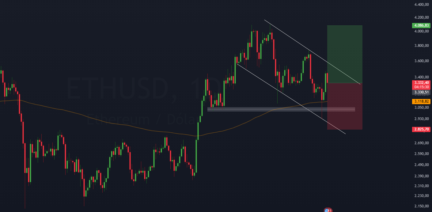 Podemos observar que o ativo está em uma tendencia de alta e passando por um período de correção. Correção que segue formando um padrão de continuidade similar a uma bandeira de alta. Junto com esse fator, temos uma EMA de 200 períodos servindo como suporte para o preço na zona dos U$ 3000.
