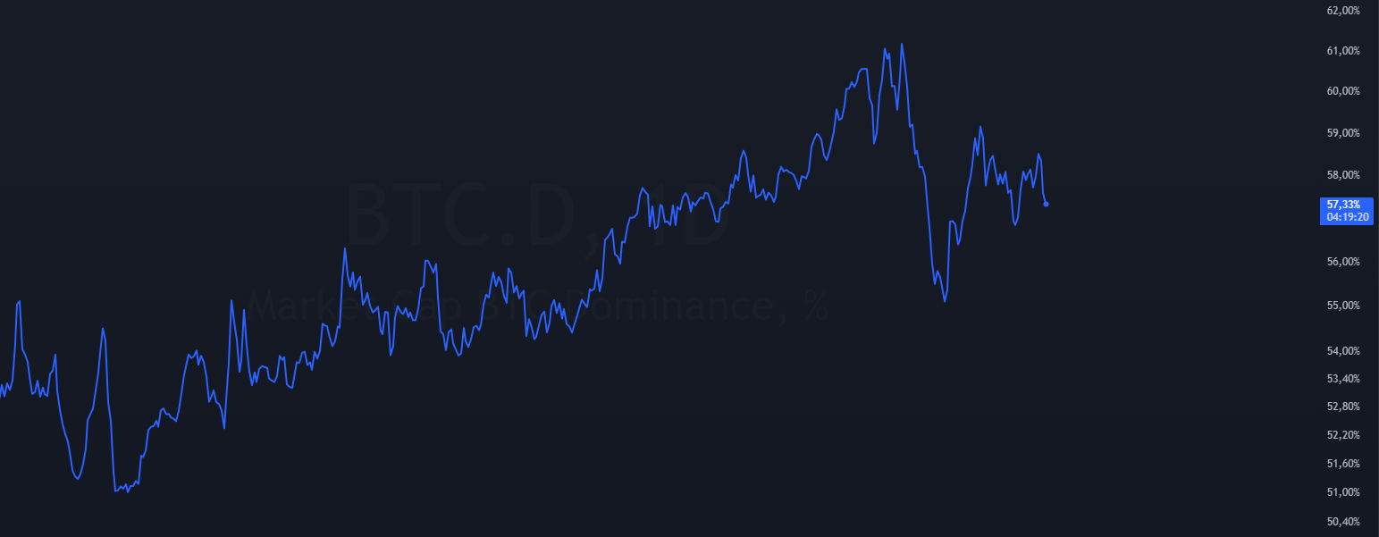 Com as recentes entradas de capital no mercado cripto, estamos vivenciando um momento em que os investidores estão com apetite ao risco a diversos novos projetos. Mas não apenas isso, as altcoins mais bem estabelecidas estão ganhando espaço e isso vem refletindo na queda da dominância do Bitcoin. Caso você não saiba, a dominância do Bitcoin representa a porcentagem do valor de mercado do Bitcoin em relação ao valor de mercado total de todas as criptomoedas. Ela é usada para medir a influência e o peso do Bitcoin no mercado cripto. Se a dominância aumenta, isso indica que o Bitcoin está superando outras criptos em desempenho ou interesse. Se diminui, altcoins estão ganhando destaque.
