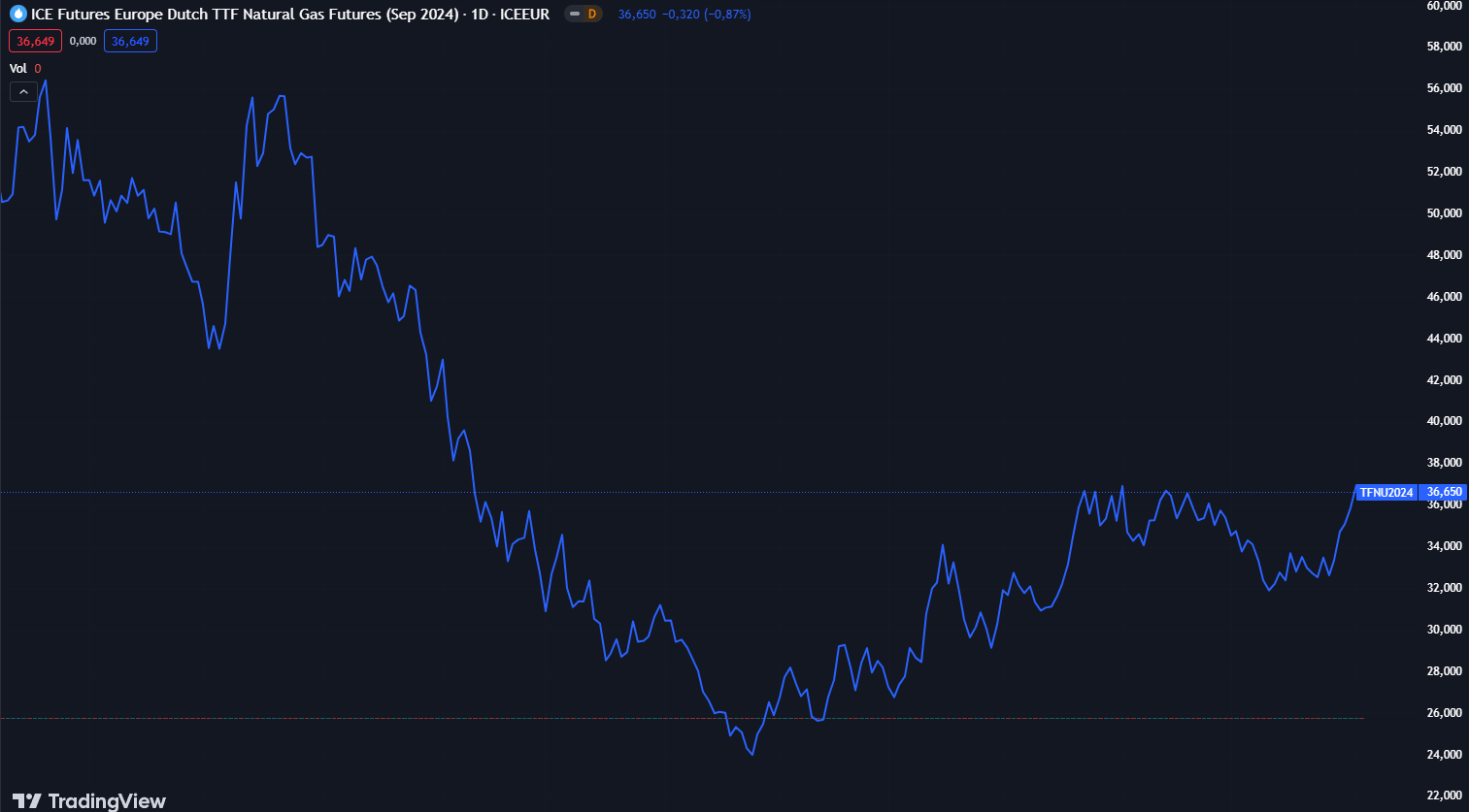 Os contratos futuros de gás holandês para setembro fecharam a € 35,87 o megawatt-hora no centro Title Transfer Facility, na Holanda.