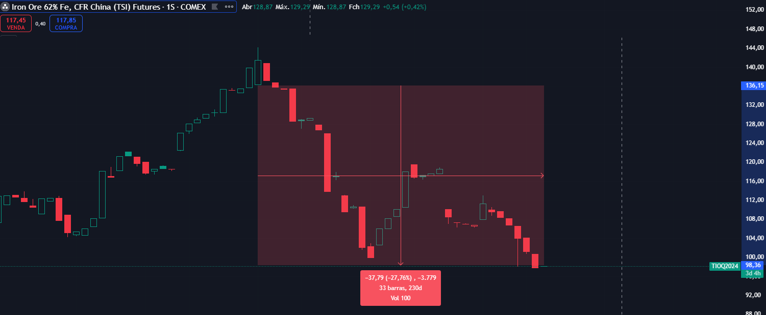 Os contratos futuros de ferro já sofrem uma queda acumulada de 27,8% desde o início do ano.