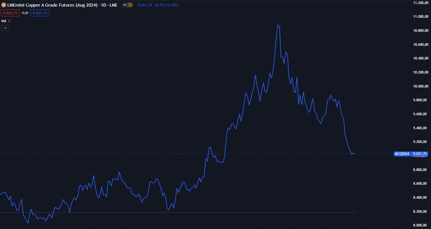 O cobre encerrou a sexta-feira no patamar de U$ 9.031 a tonelada na LME.