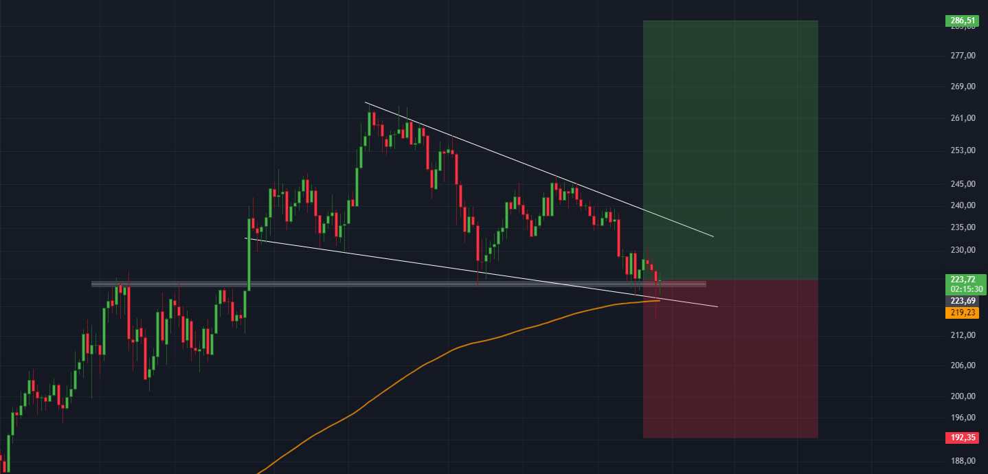 Podemos observar que o ativo está em uma tendencia de alta e passando por um período de correção. Correção que segue formando um padrão de cunha descendente de alta. Seu rompimento pode levar o preço para regiões proximas a U$290. Junto a isso, temos uma EMA de 200 períodos formando um suporte na base deste padrão.