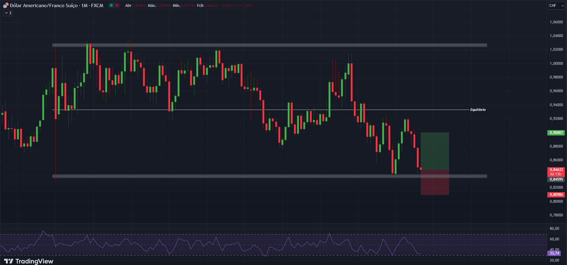 Sendo assim, temos uma grande expectativa de que os próximos cortes de juros nos Estados Unidos sejam mais moderado. Em contrapartida, a taxa de juros da Suiça permanece bem distante de se tornar vantajosa frente a dos Estados Unidos. Isso no curto prazo pode nos trazer uma oportunidade de se posicionar a favor do dólar americano. Como observado graficamente, a cotação do USDCHF sempre manteve um equilíbrio vantajoso pra ambas as economias. Com períodos de fortalecimento do dólar, e períodos de fortalecimento do franco suíço.
