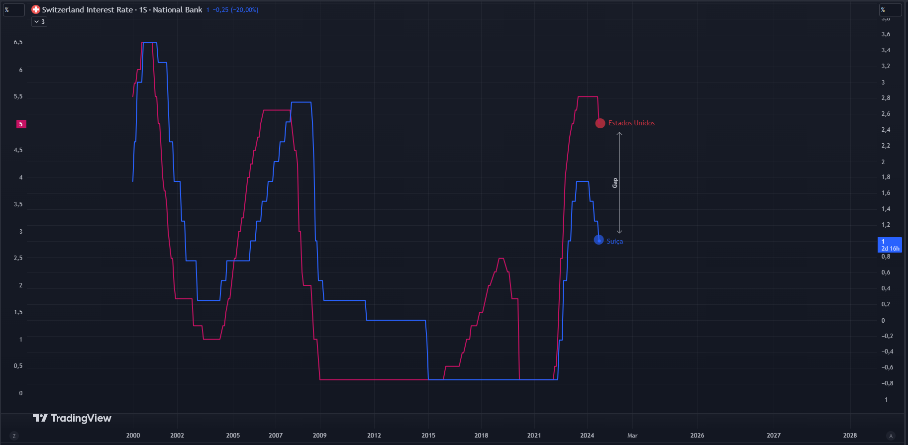 Por exemplo, neste exato momento temos Estados Unidos com sua taxa de juros em 5,00%. Na Suiça temos a taxa de juros em 1,00% e ainda sem projeção do próximo patamar de juros. Mesmo que em projeção de redução nos Estados Unidos, essa diferença de juros entre os dois países ainda é muito grande (representado pelo gap entre os gráficos). O que no curto prazo ainda pode ser mais vantajoso estar posicionado a favor do dólar americano frente ao franco Suiço.